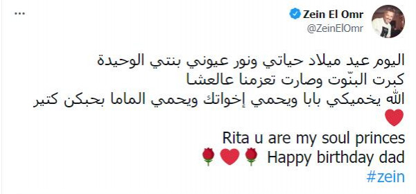 نشر الفنان اللبناني زين العمر عبر صفحته الخاصة على تطبيق(تويتر)، صورة عائلية جديدة تظهر فيها ابنته ريتا التي لفتت الأنظار بجمالها ونعومة ملامحها.