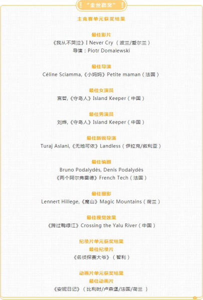 الرئيسية" وقسم "البانوراما" وقسم "أسواق الأفلام" وما إلى ذلك انعقدت في الفترة من 8 إلى 12 ديسمبر 2021 في مدينة فوتشو بالصين.