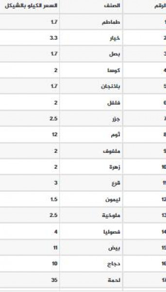 جاءت أسعار الخضروات والفواكه والدجاج واللحوم في قطاع غزة اليوم الثلاثاء كما يلي:
