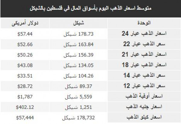 جاءت أسعار الذهب في الأسواق الفلسطينية، اليوم الثلاثاء، وفقًا للشيكل الإسرائيلي والدولار الأمريكي على النحو التالي: