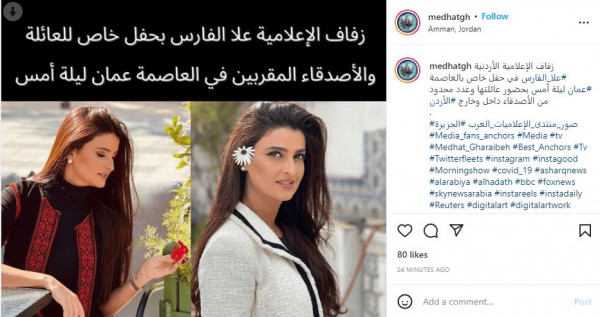 ولم تكشف الإعلامية الأردنية عن هوية عريسها أو تفاصيل أكثر حول زفافها، فيما ذكرت الصفحات المهتمة بالمشاهير على (إنستغرام) أن علا فارس تزوجت في حفل خاص بالعاصمة عمان، مساء الأحد، بحضور عائلتها وعدد محدود من الأصدقاء.