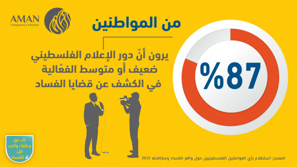 دور الإعلام الفلسطيني ما زال ضعيف أو متوسط الفعّالية في الكشف عن قضايا الفساد في العام 2021