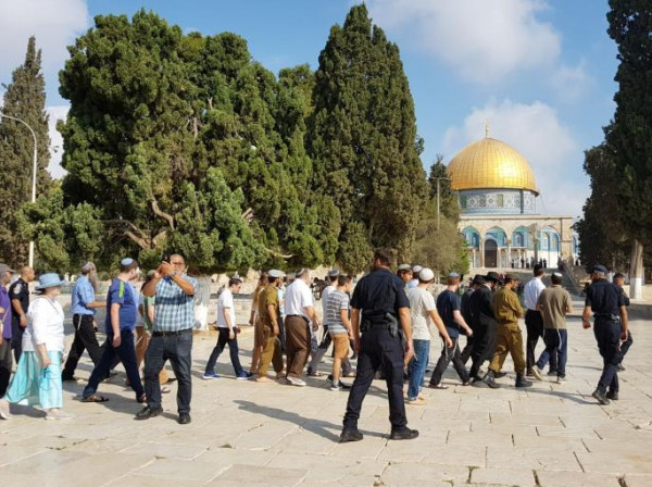 ووفق الوكالة الفلسطينية الرسمية، فإن عشرات المستوطنين اقتحموا المسجد الأقصى المبارك، ونفذوا جولات استفزازية وأدوا طقوسًا تلمودية في باحاته، تحت أعين شرطة الاحتلال، التي تولت حراسة وحماية المقتحمين.