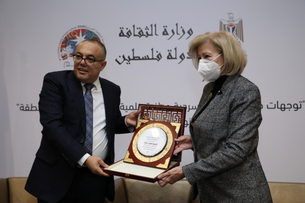 وقدم أبو سيف درعا تكريميا للنجار تقديرا لدور وزارة الثقافة الأردنية في خلق جسور ثقافية بين البلدين، واحتضان الفعاليات الثقافية الفلسطينية.