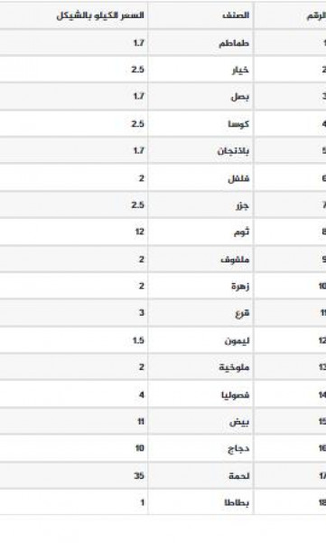 جاءت أسعار الخضروات والفواكه والدجاج واللحوم في قطاع غزة اليوم الأحد كما يلي: