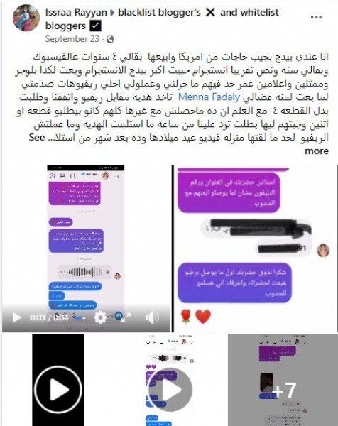 وحذرت إسراء ريان من التعامل مع الفنانة المصرية منة فضالي، وكتبت بمنشور عبر (فيسبوك): "هي لو كانت فضلت ما ردتش عليا يمكن ماكنتش هنزلها بلاك ليست انما تنكر انها استلمت مني وتقولي الفستان ده بتاعي انا اصلا بلبس براندات وعندي كل الوانو.. ده اكدلي انها قاصده تعمل كده وتستحل حق مش حقها لاني في الاول ظنيت انها ناسيه هي جابته منين لكن ردها ده اثبتلي نيتها وعشان كده نزلتها بلاك ليست.. بحذركو حد يتعامل معاها لانها استحلت فلوس ومجهود غيرها عيني عينك".