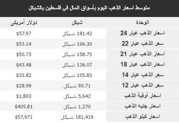 سُجلت أسعار الذهب في أسواق فلسطين، اليوم الاثنين، وفقًا للشيكل الإسرائيلي والدولار، على النحو التالي: