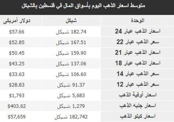 جاءت أسعار الذهب في الأسواق الفلسطينية، اليوم الثلاثاء، وفقًا للشيكل الإسرائيلي والدولار الأمريكي على النحو التالي:
