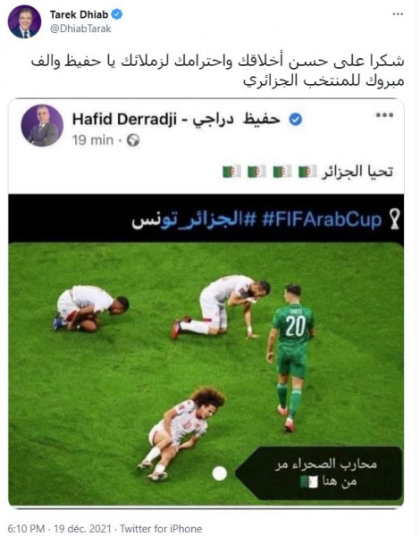 وبعد المباراة، احتفل حفيظ دراجي بفوز منتخب الجزائر بلقب كأس العرب عبر حسابه الرسمي على موقع التواصل الاجتماعي "تويتر"، حيث نشر صورة تظهر سقوط 3 من لاعبي منتخب تونس على الأرض أمام لاعب جزائري، مكتوب عليها: "محارب الصحراء مر من هنا".