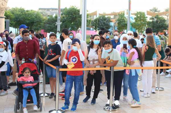 ويصطف الزوار، امام ساحة جناح فلسطين في طوابير، خصوصاً في فترة الصباح والمساء، انتظاراً للدخول إلى البوابة الرئيسية للمعرض، حيث سجل متوسط الزائرين خلال اليوم نحو 6الاف زائر، من مختلف بلدان العالم.