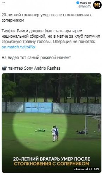 وقال حساب (match tv) الروسي على موقع التواص الاجتماعي (تويتر) إن الحارس المتوفي يبلغ من العمر (20 عامًا)، ويدعى توفيق رمزي، وهو حارس فريق (تورنادو) الإندونيسي المشارك في منافسات دوري الدرجة الثالثة.
