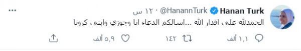 أعلنت الفنانة المعتزلة حنان ترك عن إصابتها بفيروس (كورونا) هي وعائلتها، وذلك من خلال تغريدة نشرتها عبر صفحتها الخاصة على تطبيق (تويتر)، قالت فيها: " الحمدلله على أقدار الله.. أسالكم الدعاء".