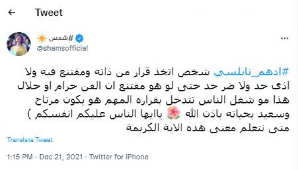 وقالت شمس في تغريدتها: " ادهم نابلسي شخص اتخذ قرار من ذاته ومقتنع فيه ولا اذى حد ولا ضر حد حتى لو هو مقتنع ان الفن حرام او حلال هذا مو شغل الناس تتدخل بقراره المهم هو يكون مرتاح وسعيد بحياته باذن الله ( ياايها الناس عليكم انفسكم ) متى نتعلم معنى هذه الاية الكريمة".