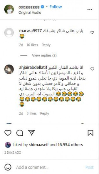 وعلّق متابع آخر مستنجداً بنقيب الموسيقيين هاني شاكر: " أنا بناشد الفنان الكبير و نقيب الموسيقيين الأستاذ هاني شاكر يدخل لانه الموبة دي حا تخلي عمرو دياب و حماقي و تامر حسني بدون شغل لا تقولي حمو بيكا ولا ماجدي جزمة ايه الصوت ايه العرب دي".