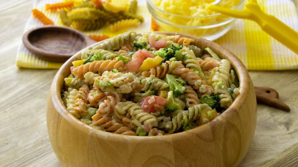 - اخلطي المكرونة، البروكلي، الفلفل الأصفر، الخيار، الطماطم في صحن السلطة، وقلبيهم جيداً.