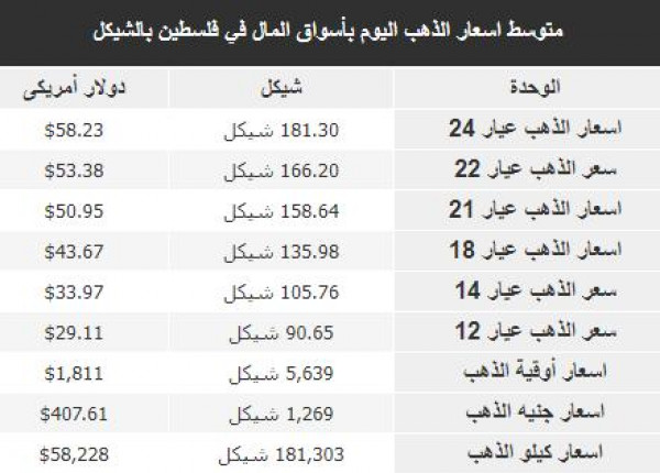 جاءت أسعار الذهب في أسواق فلسطين، اليوم الثلاثاء، وفقًا للشيكل الإسرائيلي والدولار الأمريكي، على النحو التالي: