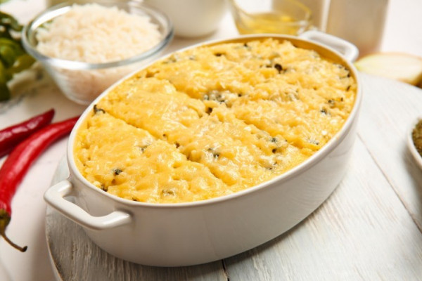 - ادهني قالب فرن بالقليل من الدهون، ورصي به الأرز بالدجاج.
