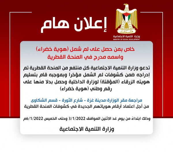 أصدرت وزارة التنمية الاجتماعية في قطاع غزة، مساء اليوم الأحد، بياناً صحفياً حول الحاصلين على لم الشمل (هوية خضراء) واسمه مدرج في المنحة القطرية.