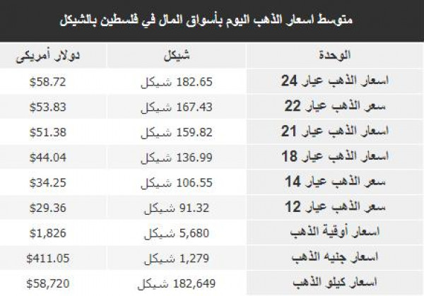 سُجلت أسعار الذهب في أسواق فلسطين، اليوم الاثنين، 3 كانون الأول/ يناير 2022، وفقًا للشيكل الإسرائيلي والدولار، على النحو التالي: