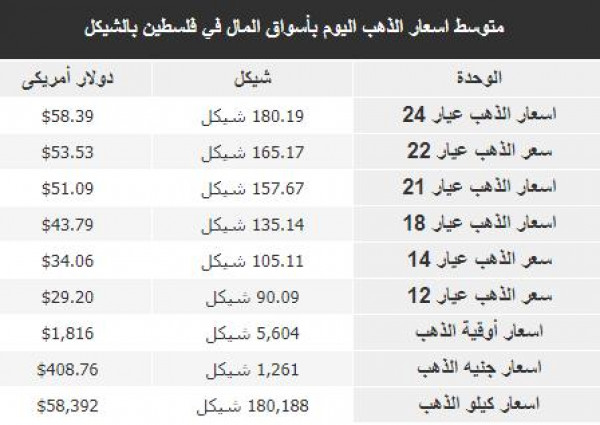 جاءت أسعار الذهب في الأسواق الفلسطينية، اليوم الأربعاء، وفقًا للشيكل الإسرائيلي والدولار الأمريكي على النحو التالي: