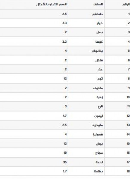 جاءت أسعار الخضروات والفواكه والدجاج واللحوم في قطاع غزة اليوم الخميس كما يلي: