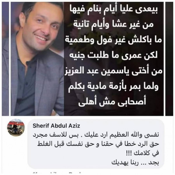 ليرد عليه شريف عبد العزيز الشقيق الأكبر لهم: "نفسي والله العظيم أردّ عليك بس للأسف مجرد الرد عليك خطأ في حقنا، وحق نفسك قبل الغلط في كلامك.. بجد ربنا يهديك".