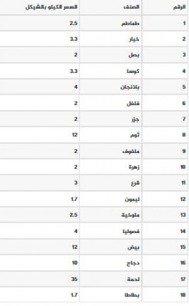 جاءت أسعار الخضروات والفواكه والدجاج واللحوم في قطاع غزة اليوم السبت كما يلي: