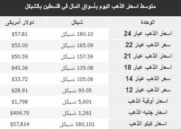سُجلت أسعار الذهب في أسواق فلسطين، اليوم الأحد، وفقًا للشيكل الإسرائيلي والدولار، على النحو التالي: