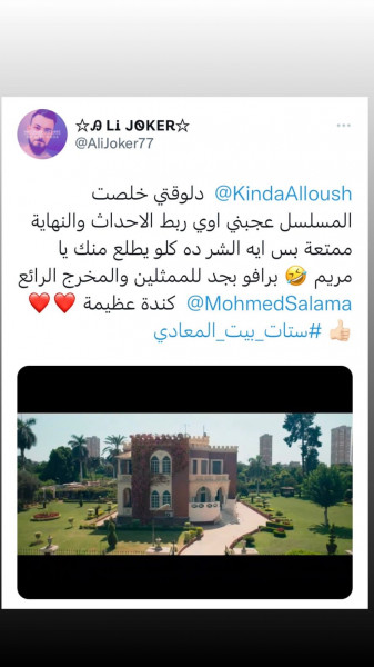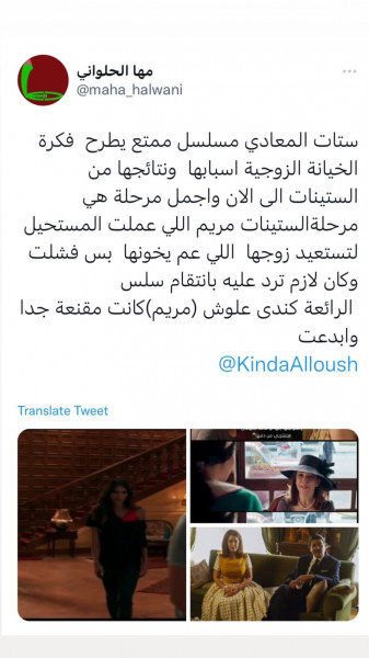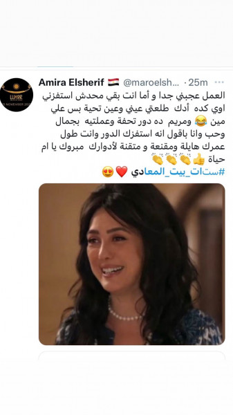وفي تغريدة أخرى كتبت (مها) "ستات بيت المعادي مسلسل ممتع يطرح فكرة الخيانة الزوجية أسبابها ونتائجها من الستينيات إلى الآن وأجمل مرحلة هي الستينيات، مريم اللي عملت المستحيل لتستعيد زوجها اللي عم يخونها بس فشلت وكان لازم ترد عليه بانتقام سلسل الرائعة كندة علوش (مريم) كانت مقنعة جداً وأبدعت" وغيرها الكثير من ردود الفعل القوية من مصر والوطن العربي.