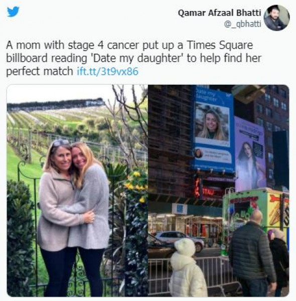 وافقت أم مصابة بالسرطان على نشر إعلان في أحد لوحات ميدان تايمز الشهير في مدينة نيويورك الأمريكية، ومضمونه ببساطة هو البحث عن شريك مثالي لابنتها.