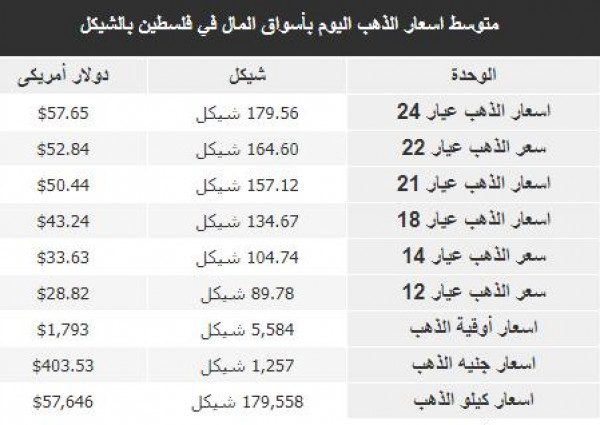سُجلت أسعار الذهب في أسواق فلسطين، اليوم الاثنين، وفقًا للشيكل الإسرائيلي والدولار، على النحو التالي: