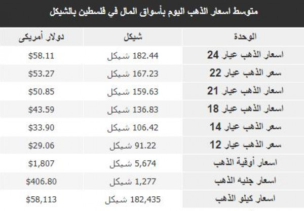 سُجلت أسعار الذهب في أسواق فلسطين، اليوم الثلاثاء، وفقًا للشيكل الإسرائيلي والدولار، على النحو التالي: