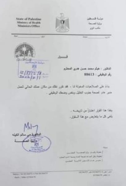 يأتي ذلك في نص القرار الذي حصلت "دنيا الوطن" على نسخه منه، والذي قالت فيه الوزارة: "بناء على الصلاحيات المخولة لنا فقد تقرر نقلك من مكان عملك الحالي للعمل مدير عام لصحة جنوب الخليل وبنفس وضعك الوظيفي".