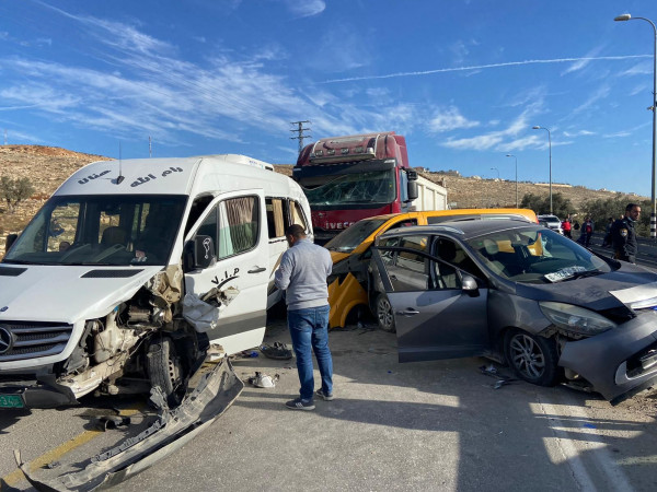 أصيب 14 مواطنًا، اليوم الأربعاء، إثر حادث سير وقع بين خمس مركبات على الشارع الواصل بين حزما وجبع، شمال شرق القدس.