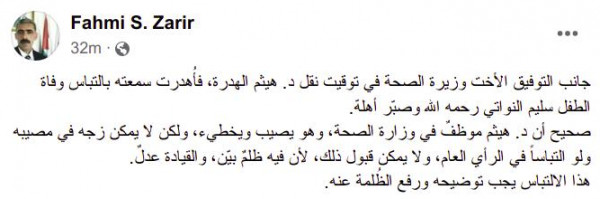وقال زعارير، عبر موقع (فيسبوك): "جانب التوفيق الأخت وزيرة الصحة في توقيت نقل د. هيثم الهدرة، فأُهدرت سمعته بالتباس وفاة الطفل سليم النواتي رحمه الله وصبّر أهلهّ".