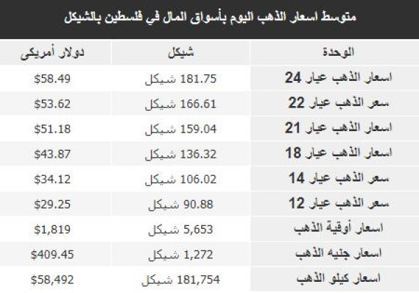 جاءت أسعار الذهب في أسواق فلسطين، اليوم الأحد، وفقًا للشيكل الإسرائيلي والدولار الأمريكي، على النحو التالي: