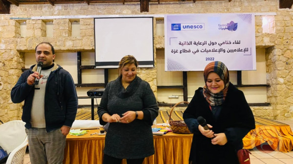 بدورها قالت المدربة هداية شمعون: "إن أهمية هذا اليوم هي التفكير الجيد فيما يمكن أن يتخذه الفرد ذاته من آليات يمكن أن تساعده في تخطي العقبات التي يواجهها في ظل التعرض الدائم للخبرات الصادمة خاصة وان بيئة عمل الإعلاميين والإعلاميات في قطاع غزة هي بيئة خطرة، مشيرة إلى آن فلسطينيات ويونسكو تعكفان حاليًا على وضع اللمسات الأخيرة لدليل تدريبي في الرعاية الذاتية وحسن الحال للإعلاميين والإعلاميات".