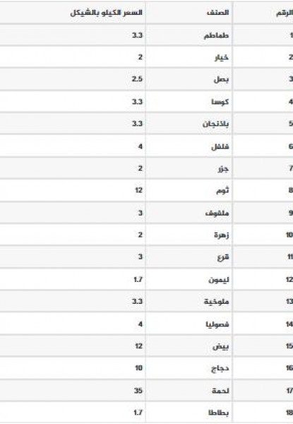 جاءت أسعار الخضروات واللحوم والدجاج في أسواق غزة اليوم الاثنين، على النحو التالي: