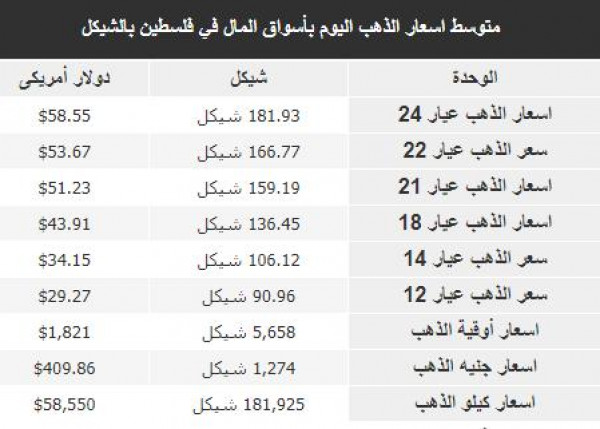 سُجلت أسعار الذهب في أسواق فلسطين، اليوم الاثنين، وفقًا للشيكل الإسرائيلي والدولار، على النحو التالي: