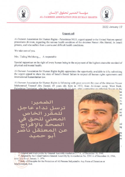 وعليه فقد توجهت الضمير بنداء عاجل إلى السيدة/ تلالينج موفوكنج، المقرر الخاص المعني بحق كل إنسان في التمتع بأعلى مستوى ممكن من الصحة البدنية والعقلية، للوفاء بواجباتها القانونية والأخلاقية وضرورة التحرك الفوري للإفراج عن المعتقل أبو حميد، وتقديم الرعاية الطبية المناسبة في أسرع وقت ممكن، والوقوف على الأوضاع الطبية في سجون الاحتلال.