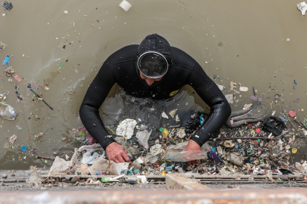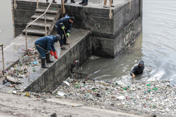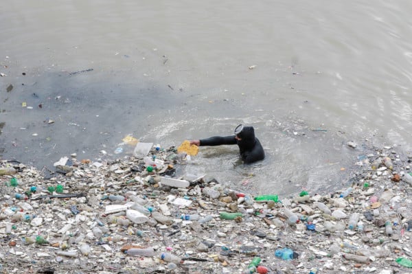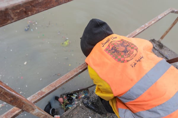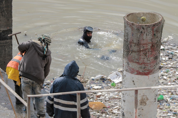 غواصون من طواقم لجنة الطوارئ التابعة لبلدية غزة ينفذون أعمال تنظيف خطوط مضخات بركة الشيخ رضوان شمال المدينة، من النفايات التي جرفتها الأمطار من الشوارع المختلفة.