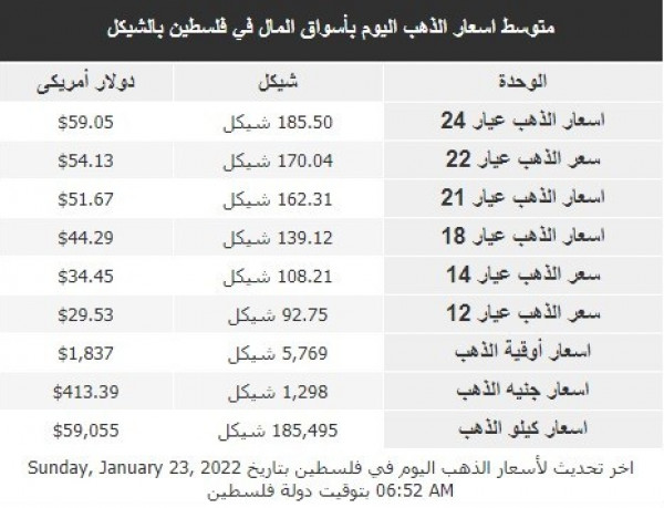 شؤون فلسطينية تعرف على أسعار الذهب في فلسطين 2022-01-23 رابط مختصر: تابعنا أيضا عبر تويتر @alwatanvoice رام الله - دنيا الوطن جاءت أسعار الذهب في أسواق فلسطين، صباح اليوم الأحد، على النحو التالي:
