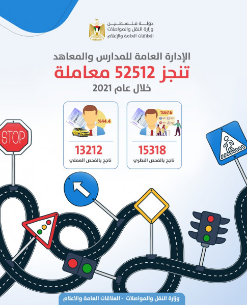 انجزت الإدارة العامة للمدارس والمعاهد بوزارة النقل والمواصلات 52512 معاملة خلال العام الماضي مجزأة ما بين الفحوصات العملية والنظرية.