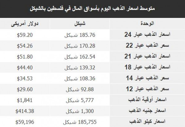 شهدت اسعار الذهب، في الأسواق الفلسطينية، اليوم الخميس، بعض التغييرات من كافة الأعيرة، وذلك وفقا للأسواق العالمية، حيث جاءت الأسعار على النحو التالي: