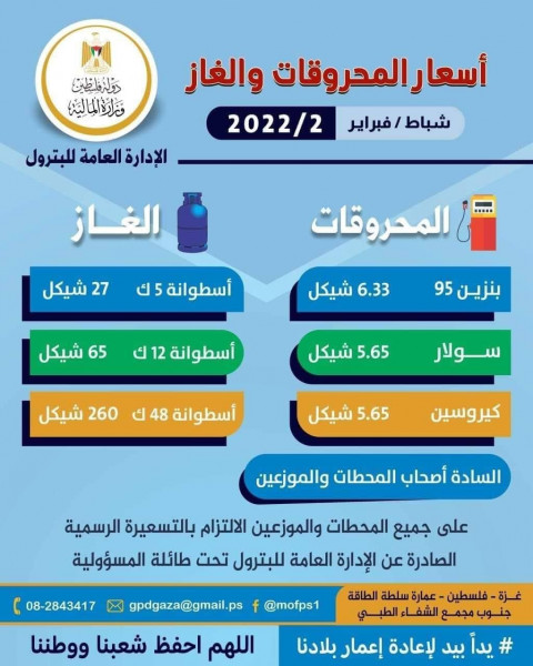كشفت وزارة المالية، بغزة، اليوم الاثنين، عن أسعار المحروقات لشهر شباط/فبراير المقبل.