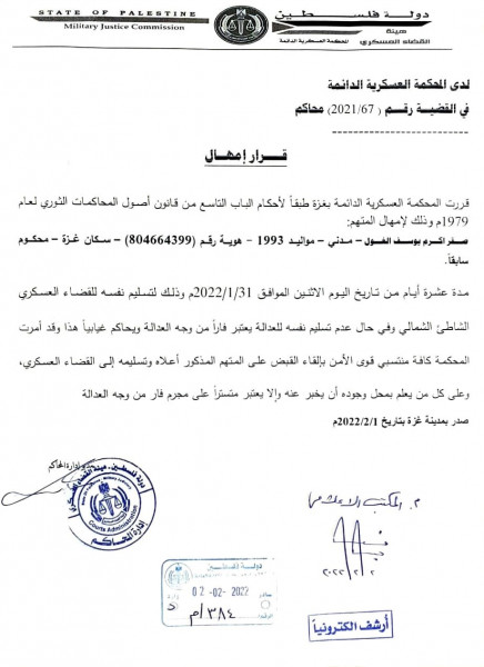 أمهلت المحكمة العسكرية الدائمة- التابعة لهيئة القضاء العسكري المتهم/ صقر اكرم يوسف الغول، هوية رقم (804664399)، سكان غزة، عشرة أيام من تاريخ يوم الإثنين الموافق 31/01/2022م، لتسليم نفسه للقضاء العسكري.