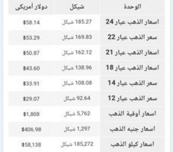 جاءت أسعار الذهب في الأسواق الفلسطينية، اليوم الجمعة 4 فبراير 2022، وفقًا للشيكل الإسرائيلي والدولار الأمريكي على النحو التالي: