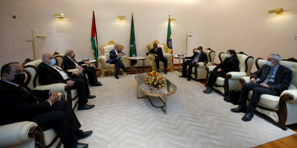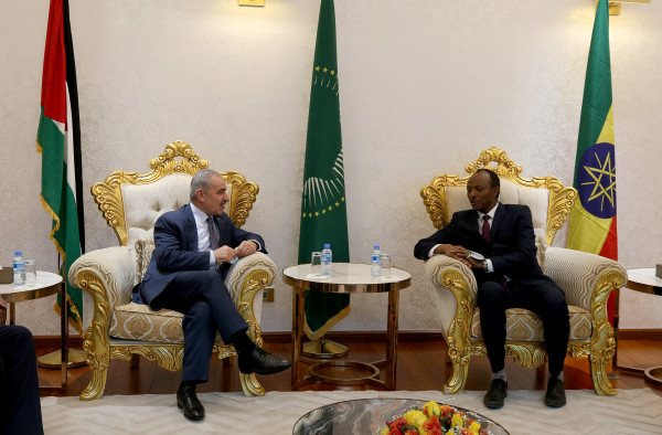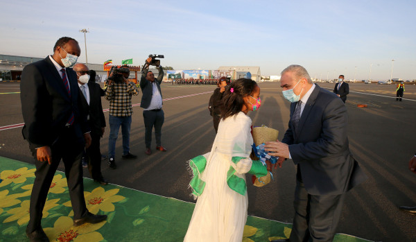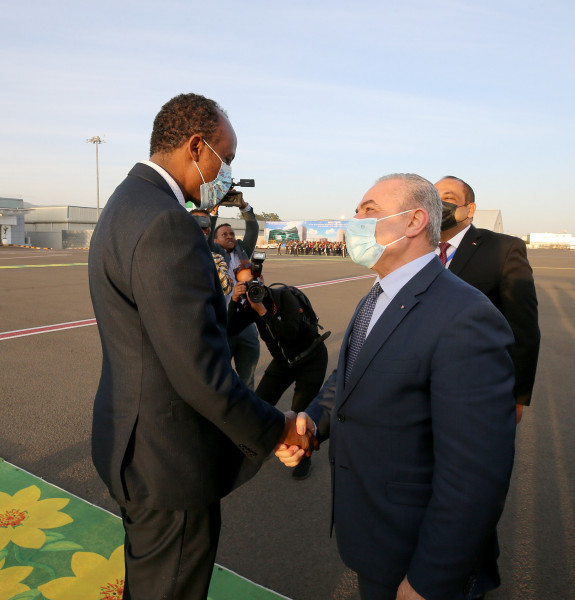 وكان في استقبال رئيس الوزراء لدى وصوله وزير الطاقة والمياه الإثيوبي هابتامو إيتيفا، وسفير دولة فلسطين لدى جمهورية أثيوبيا الإتحادية فارس القب.