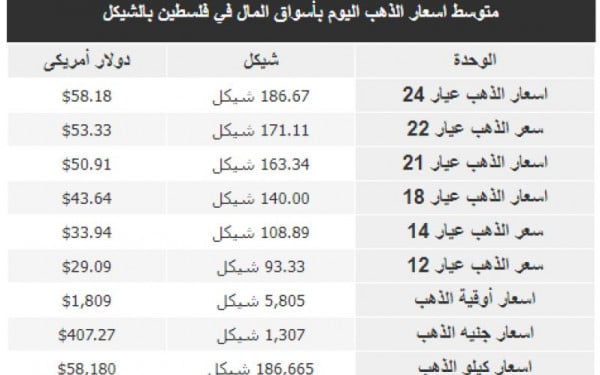 سُجلت أسعار الذهب في أسواق فلسطين، اليوم الاثنين، وفقًا للشيكل الإسرائيلي والدولار، على النحو التالي: