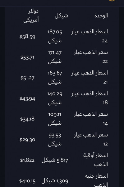 سُجلت أسعار الذهب في أسواق فلسطين، اليوم الثلاثاء، وفقًا للشيكل الإسرائيلي والدولار، على النحو التالي: